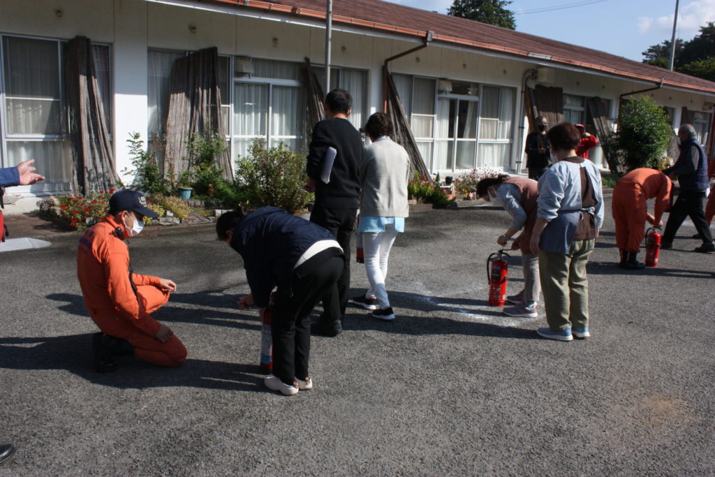 避難が完了し、消防の方のお話を聞いた後、職員による消火訓練を見学。